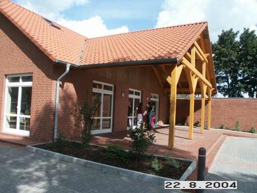 Seitansicht auf das von Architektin H. Bruns und Architekt H. Spille gebaute Clubheim mit großer, überdachter Terrasse.